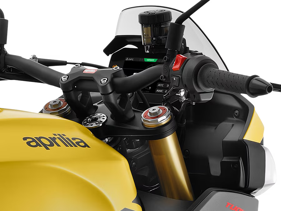 A Tuono V4 vem equipada com um moderno painel TFT de 5 polegadas com proteção ótica. Os comandos retroiluminados são de fácil utilização e asseguram uma excelente visibilidade de dia e de noite. A experiência tecnológica Aprilia atinge o seu máximo com o pack eletrónico APRC (Aprilia Performance Ride Control). Totalmente customizável, mesmo através de compra in-app, eleva a performance e a segurança a níveis extraordinârios, em estrada e em pista.
