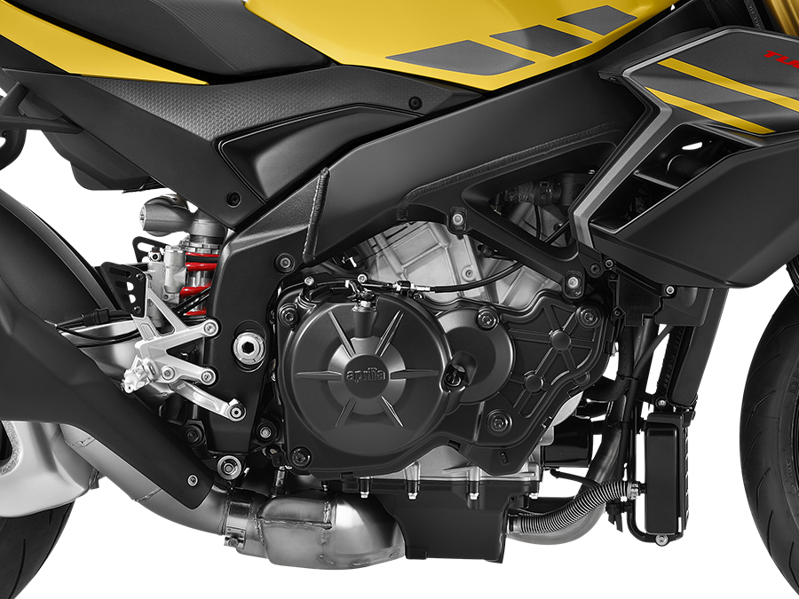 O coração da Tuono é um motor V4 1099cc a 65°, o culminar da tecnologia Aprilia. Único em performance e sonoridade, foi desenhado para oferecer uma potência que é explosiva mas totalmente controlável através de uma resposta suave do acelerador. Homologada Euro 5+, liberta 180 cv e um binário de 121 Nm com uma entrega forte a todas as rotações, sendo perfeita até para condução dinâmica em estrada.
