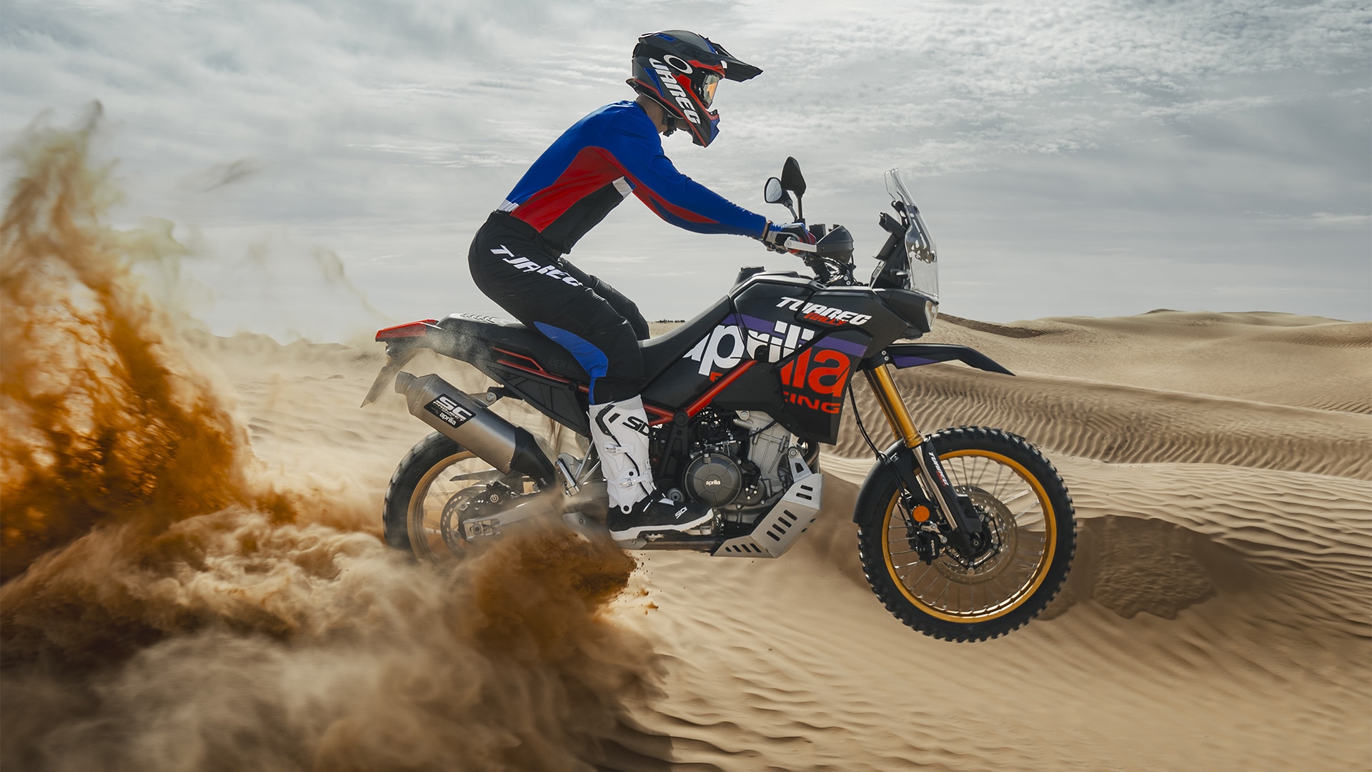 A Aprilia Tuareg Rally está disponível no mesmo esquema cromático rally race replica da moto conduzida por Jacopo Cerutti com a qual cruzou a linha de meta em Dakar em primeiro lugar. A forquilha, as jantes e o guiador, desenhados para as condições mais extremas, são acabados em dourado anodizado, enquanto que a proteção de cárter em alumínio reforçado e o novo pára-lamas alto demonstram bem o caráter off-road. O banco e o guiador foram elevados de forma a incrementar o controlo da condução em pé em terrenos particularmente difíceis.